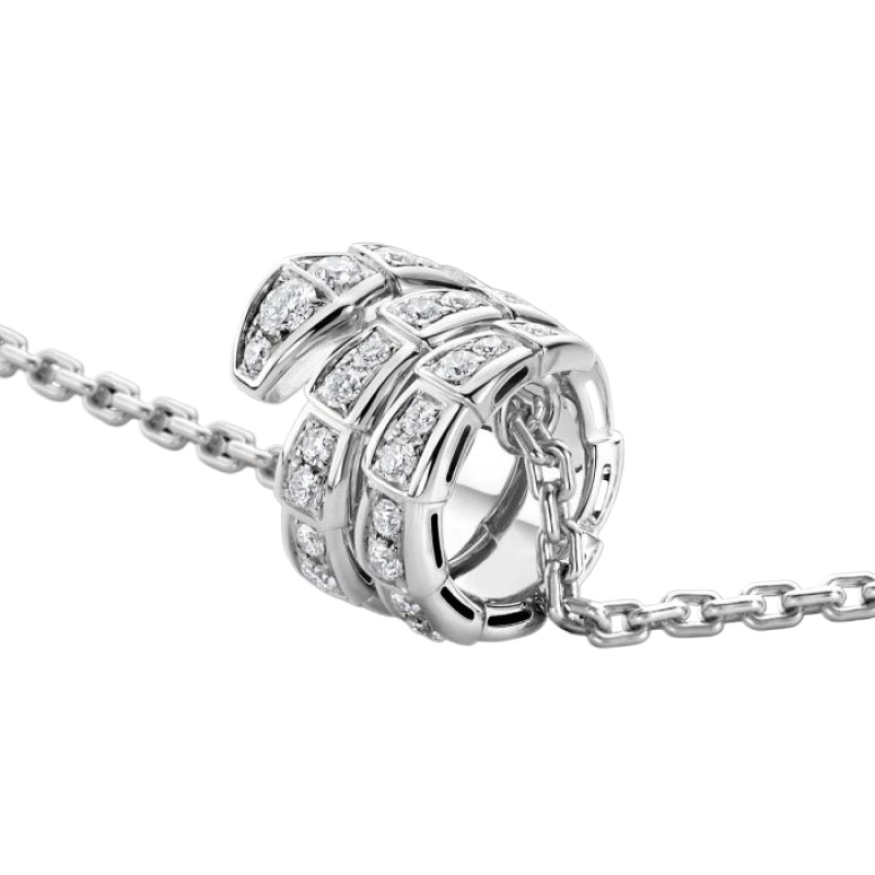 The Serpenti Viper necklace in 18K white gold, fully pavé-set with diamonds, is a signature style that combines pure beauty, circumferential shapes and allure, a simple and concise interpretation of the endless transformation and evolution of Bulgari’s classic creations. This glamorous jewelry piece embodies the powerful characteristics of the mysterious snake’s constant transformation, inspiring people to actively seek change and regard it as an inexhaustible source of strength and confidence. It is suitable for mixing and matching at will, providing a variety of styling options, showing the flexible and versatile style of the series.
