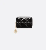 The Lady Dior Voyageur coin purse is both timeless and spacious. Crafted in black patent calfskin with Cannage topstitching, it is enhanced by detachable D.I.O.R. charms. A chic and compact companion, the small coin purse will pair elegantly with other Lady Dior creations.