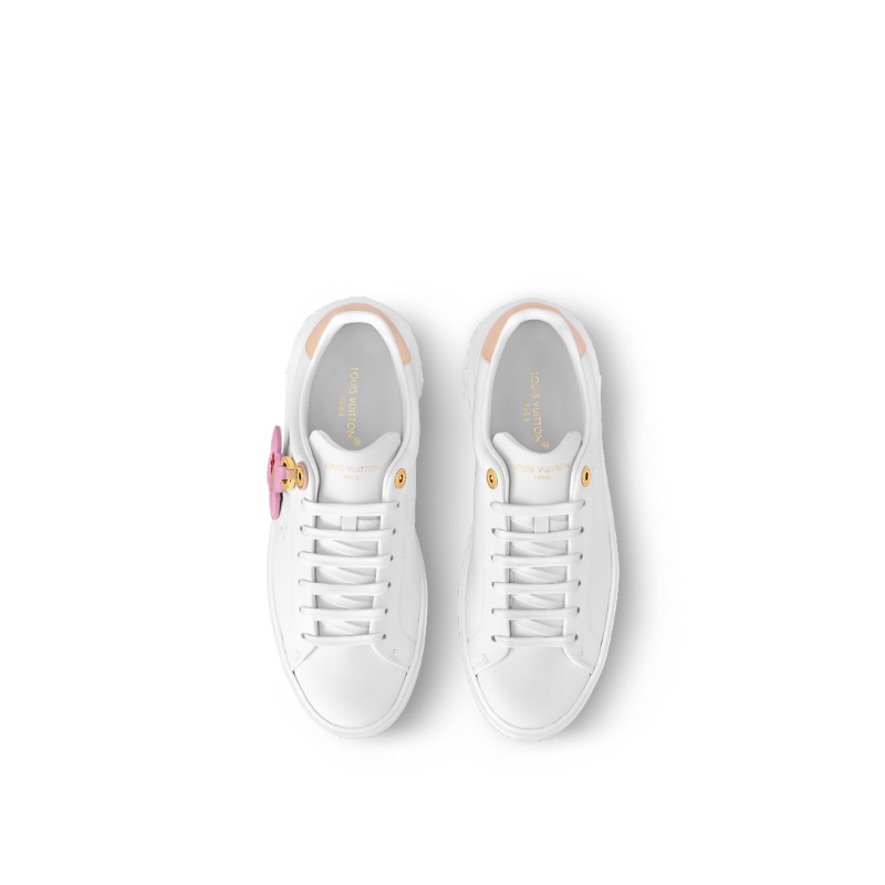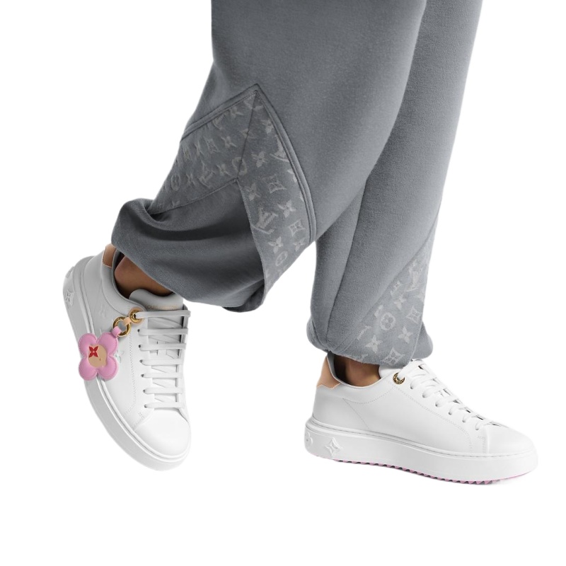 This refined interpretation of the Time Out sneaker comes in soft calf leather, which is discreetly embossed with the LV Initials and Monogram Flowers on the side. A pastel-colored charm featuring the Louis Vuitton Vivienne mascot hangs from an engraved, gold-toned ring. The back of the sneaker is trimmed with the House’s emblematic natural leather.