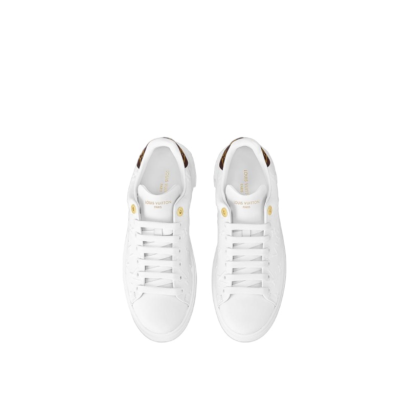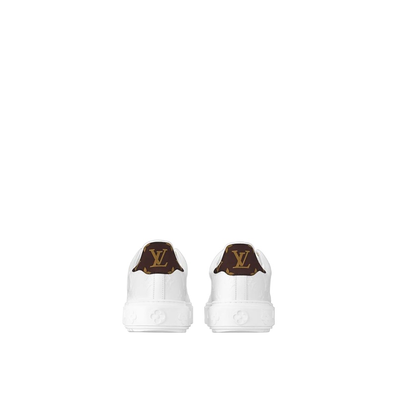 The emblematic Time Out sneaker is revisited in soft calf leather, which is debossed with the Louis Vuitton signature and the Monogram pattern. The design is complemented by a trim in recycled Monogram nylon at the back. This model is finished with an elevated rubber outsole with a 3-D pattern of Monogram Flowers.