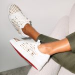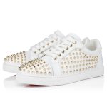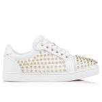The timeless Vieira Night Spikes sneaker has an irresistibly bold design. This sneaker is crafted in supple white calf leather and has a black rubber sole. It features nappa leather trim for a sophisticated finish. It is adorned with all-over Maison Christian Louboutin signature gold spikes.