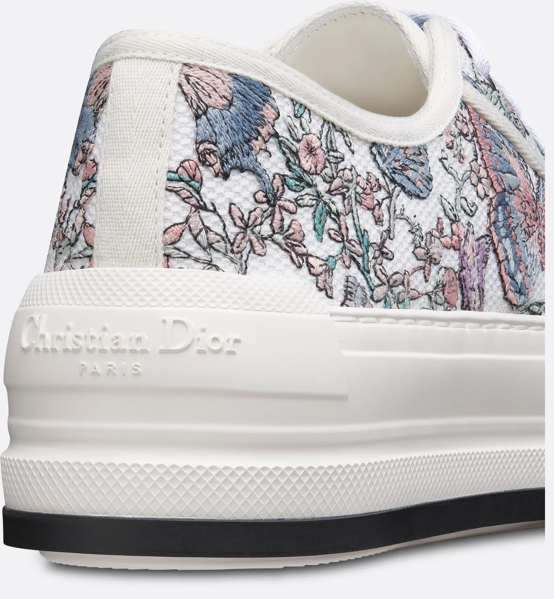 The Walk’n’Dior platform sneaker elevates the line with a modern creation. The embroidered cotton upper features Pietro Ruffo’s white multicolor Toile de Jouy Papillon motif, showcasing delicate butterflies in an elegant and dreamlike floral setting. The style is completed by a comfortable and ultralightweight thick sole, tongue and laces, each with the Christian Dior signature. The sneaker will add a contemporary touch to any laid-back look and can be paired with other Toile de Jouy Papillon creations from the collection.