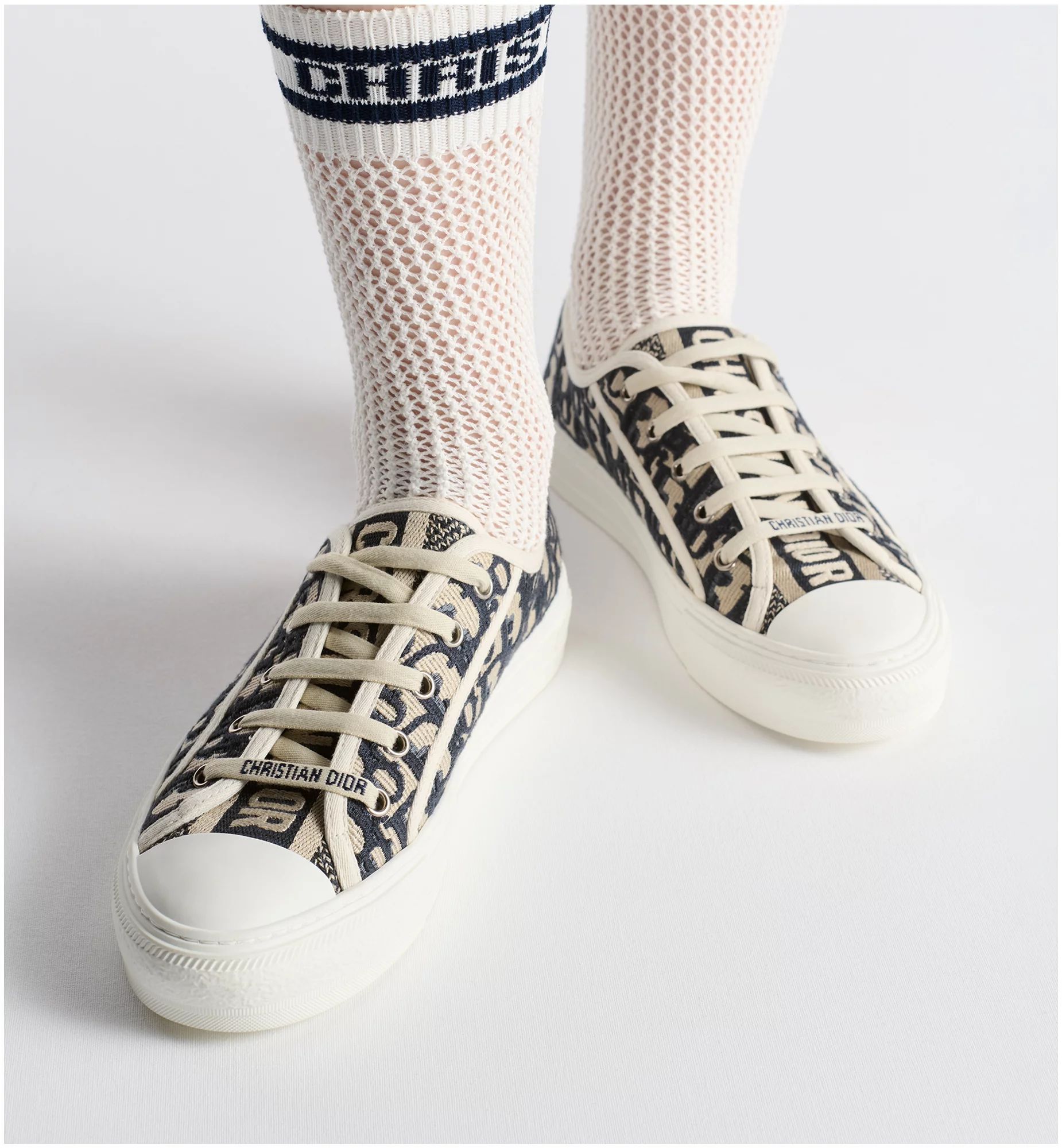 The Walk’n’Dior sneaker is available in deep blue Dior Oblique embroidered cotton. Its relaxed design features signatures on the tongue, rubber sole and laces for a timeless look.