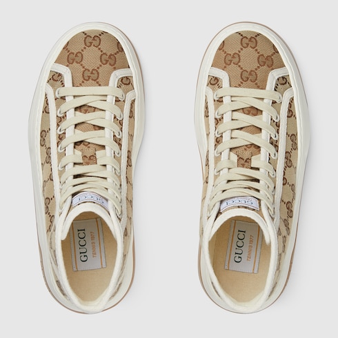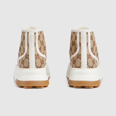 A striking silhouette that takes inspiration from the tennis courts. Presented in a classic beige and ebony Original GG canvas, this high top sneaker features a chunky sole and a contrasting fabric trim for a contemporary aesthetic.