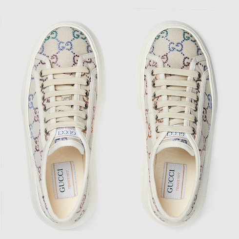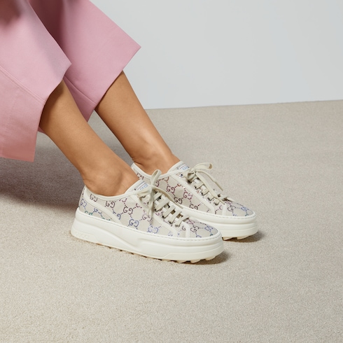 A striking silhouette that takes inspiration from the tennis courts. Presented in off white canvas with GG crystals, this low-top sneaker features a chunky sole and a contrasting trim for a contemporary aesthetic.