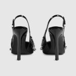 Handstitched details bring a refined and bold touch to the designs of the new collection. This pair of pumps features an ultra-feminine silhouette and glossy patent leather, further enhanced by a chain of crystals.