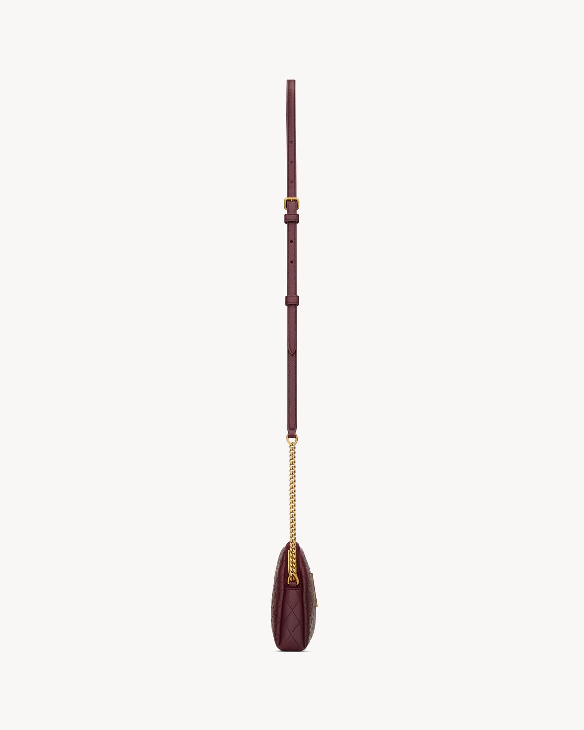 This slender and lightweight bag features an adjustable leather-and-chain strap for shoulder or crossbody carry.